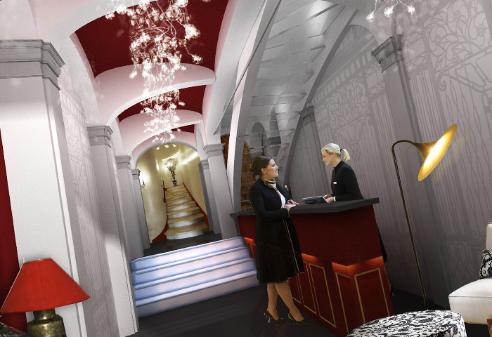 Progetto per la nuova hall di ingresso con illuminazione scenografica e scala in vetro.