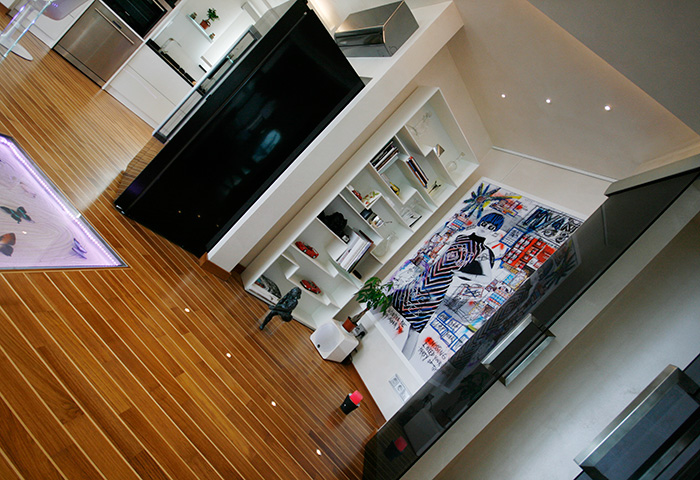 Pavimento in teak con fughe in acero, rivestimenti in mosaico e grande attenzione ad illuminazione ed effetti scenici.